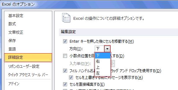 - [詳細設定]を選択し、「Enterキーを押した後にセルを移動する」にチェックを入れます。[方向]を『右、上、左』の適切なものに変更します。