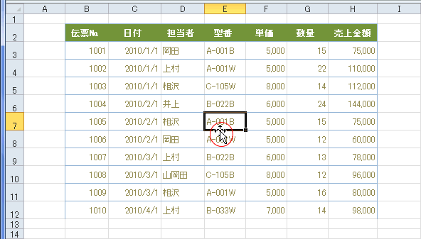 - アクティブセルの枠線をダブルクリックすると、リスト範囲の端のセルへ移動します。