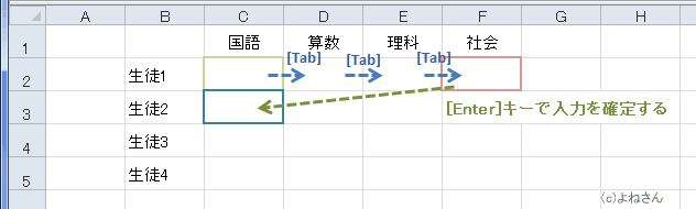 - 横方向のセルへの入力は[Tab]キーを使います。[Enter] キーで最初に[Tab]キーで移動したセルの下に移動します。
