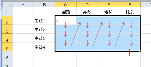 - C2:F5を選択した状態で、[Enter]キーで入力を確定していくと、C2・・・→C5→D2・・・→D5→E2・・・・・・→F5→C2 とアクティブセルが移動します。