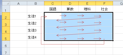 - C2:F5を選択した状態で、[Tab]キーで入力を確定していくと、C2・・・→F2→C3・・・→F3→C4・・・・・・→F5→C2 とアクティブセルが移動します。