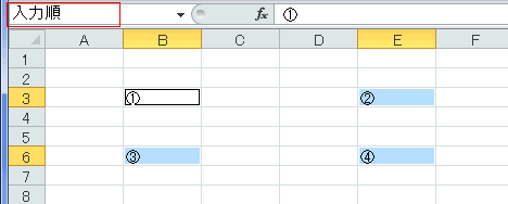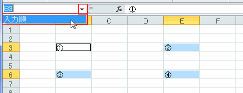 - 「名前ボックス」で『入力順』を選択すると、名前を定義した範囲が選択された状態になります。