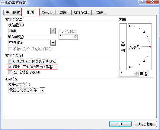 - 「セルの書式設定」ダイアログボックスの[配置]タブを選択します。