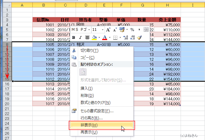 8〜15行を選択して、右クリックします。