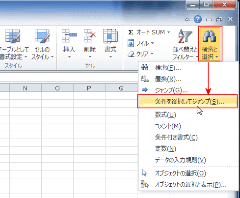 [ホーム]タブの[検索と選択]→[条件を選択してジャンプ]を実行します。