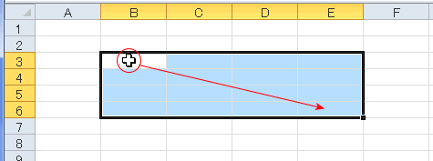 - マウスポインタが白十字の状態でセル範囲をドラッグして選択します。
