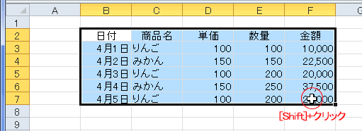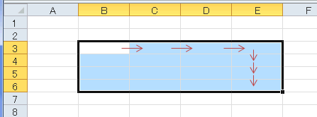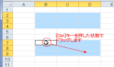 または、[Shift]+[↓]キーで行方向へセル範囲を広げ、さらに[Shift]+[→]キー列行方向へ選択範囲を広げます。
