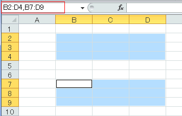 - 名前ボックスに「B2:D4,B7:D9」のようにセル範囲を「,」カンマで区切って入力します。