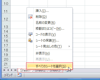 - シート見出し上で右クリックし、[すべてのシートを選択]をクリックします。