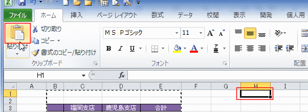 - 貼り付け先の「H1セル」を選択して、[貼り付け]を実行します。