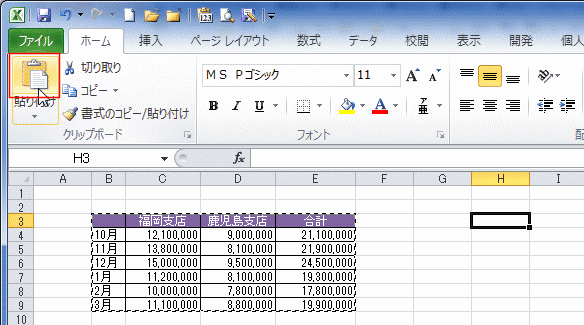- コピー先のH3セルを選択して、[貼り付け]を実行します。