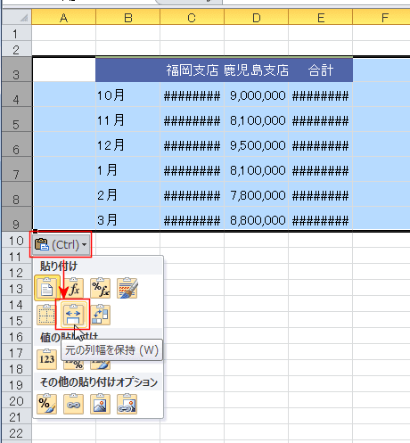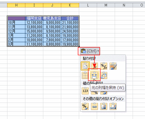 [貼り付けのオプション]ボタンをクリックして、[元の列幅を保持]を選択します。