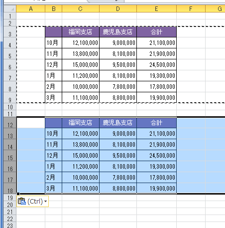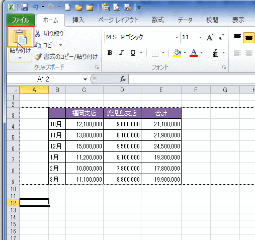 - 貼り付け先の「A12セル」を選択して、[貼り付け]を実行します。
