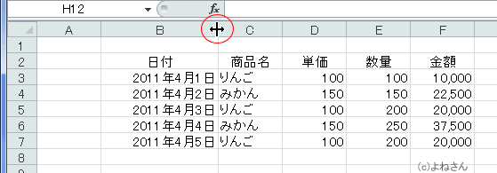 (マウスポインタを重ねるのは選択している列の右側の境界上です。)