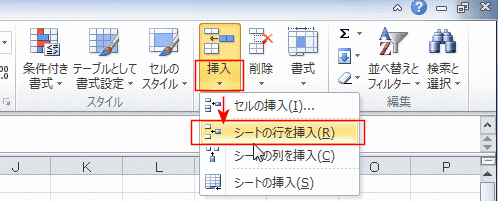- [ホーム]タブの[セル]グループにある[挿入]→[シートの行を挿入]を実行します。