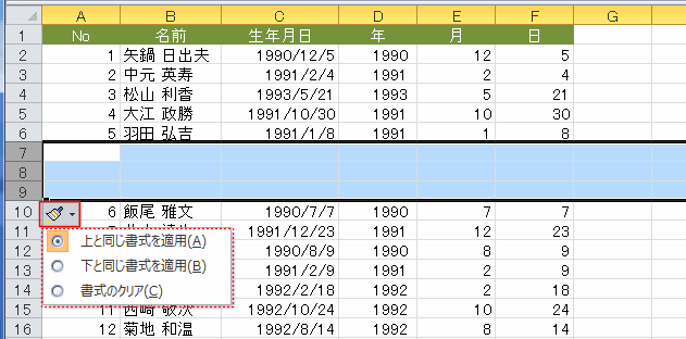 [挿入オプション]をクリックすると、上と同じ書式を適用、下と同じ書式を適用、書式のクリア の選択ができます。