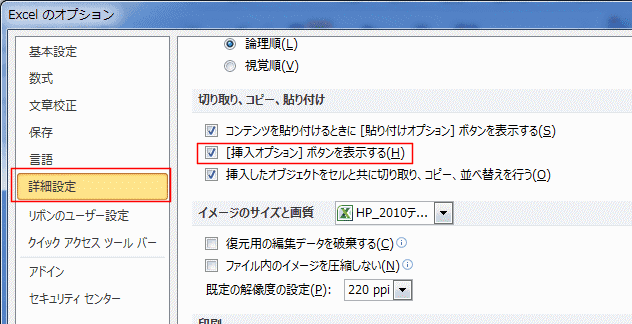 - [詳細設定]を選択し、「[挿入オプション]ボタンを表示する」のチェックを入れると、表示されます。