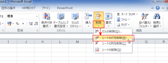 - [ホーム]タブの「セル」グループにある[削除]の下の[▼]ボタンをクリックし、[シートの行を削除]を実行します。