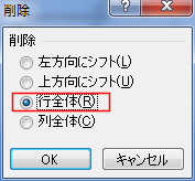 - ショートカットキー [Ctrl]+[-]を利用する場合は、削除 ダイアログが表示されますので、「行全体」を選択します。