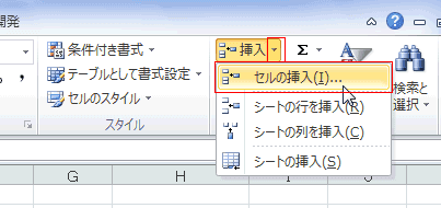 - [ホーム]タブの「セル」グループにある[挿入]の[▼]ボタンをクリックし、[セルの挿入]を実行します。