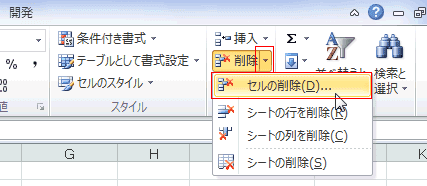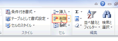 - [ホーム]タブの「セル」グループにある[削除]の横の[▼]ボタンをクリックし、[セルの削除]を実行します。
