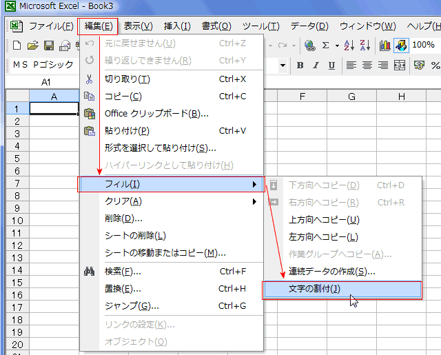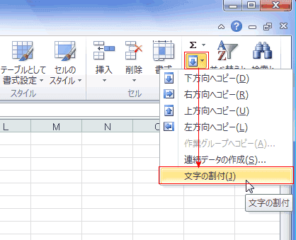 - [ホーム]タブの[編集]グループにある[フィル]→[文字の割付]を選択します。
