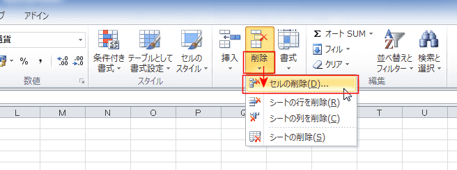 - [ホーム]タブの「セル」グループにある[削除]→[セルの削除]を実行します。