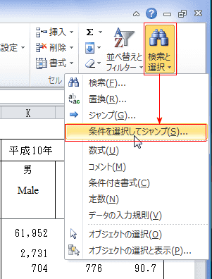 - [ホーム]タブの[編集]グループにある[検索と選択]→[条件を選択してジャンプ]を実行します。