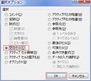 - 「空白セル」にチェックを入れて[OK]ボタンをクリックします。