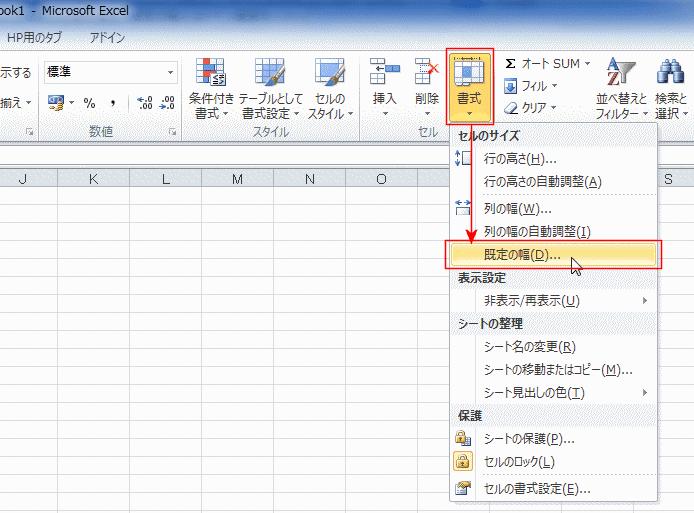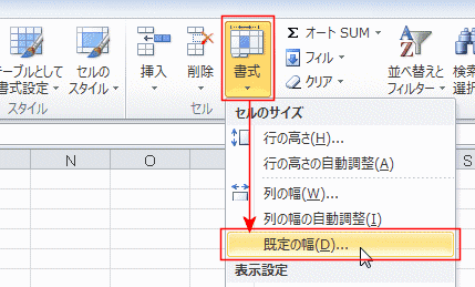 - [ホーム]タブの「セル」グループにある[書式]→[既定の幅]を実行します。
