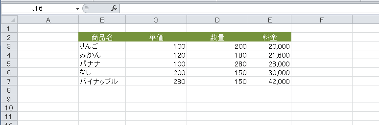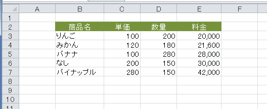 - 下図のようにB列とE列の列幅をちょっと広く変更しています。ほかの列は最初のまま変更はしていません。