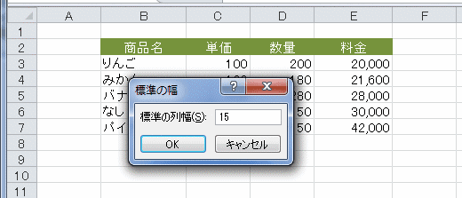 - 標準の列幅に「15」と入力して、[OK]ボタンをクリックします。