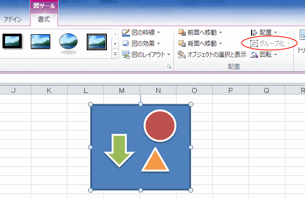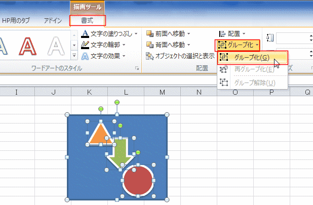 - 図形を選択して描画ツールの[書式]タブで[グループ化]を実行してグループ化します。