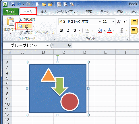 - グループ化した図形を選択して、[ホーム]タブの[コピー]でクリップボードへコピーします。(ショートカットキーは[Ctrl]+[C])