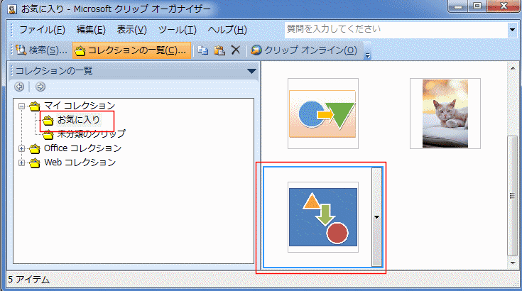 マイコレクションの「お気に入り」を選択して、[編集]→[貼り付け]を実行します。(ショートカットキーは[Ctrl]+[V])