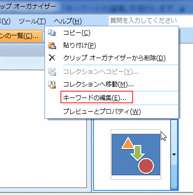 - 検索ができるように、登録した図形を右クリックして、「キーワードの編集」を実行します。