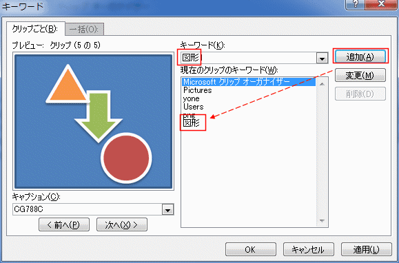 キーワードの一覧に入力したキーワード:図形が追加されました。
