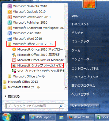 - Windowsのスタートボタンから[すべてのプログラム] →[Microsoft Office]→[Microsoft Office 2010
