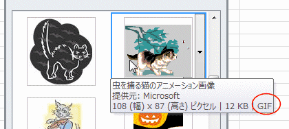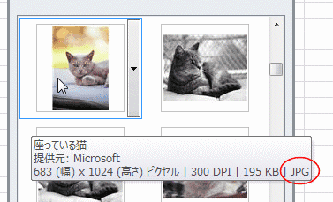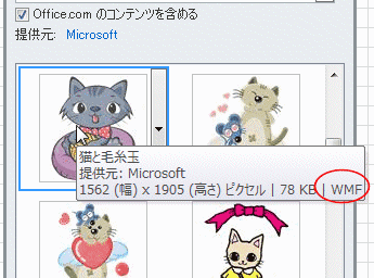- クリップアートの検索結果にマウスポインタでポイントするとファイル形式などが表示されます。