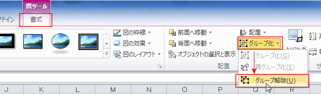 - クリップアートを選択して、図ツールの[書式]タブで[グループ化]→[グループの解除]を実行します。