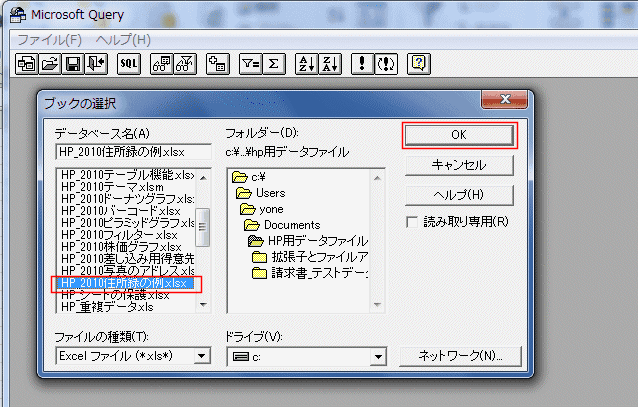 - Microsoft Queryが開き、データベースの選択 ダイアログが開きます。
