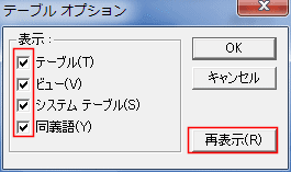 - テーブルオプションで「システム テーブル」にチェックを入れ[再表示]ボタンをクリックします。