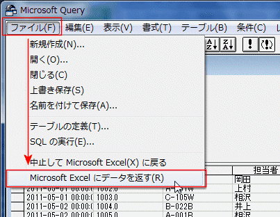 - Microsoft Queryの[ファイル]→[Microsoft Excelにデータを返す]を実行します。