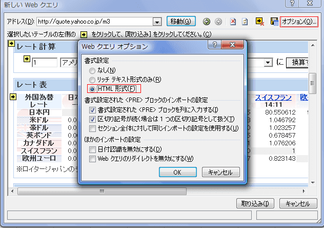 - なお、[オプション]ボタンをクリックして、「HTML形式」で取り込むこともできます。