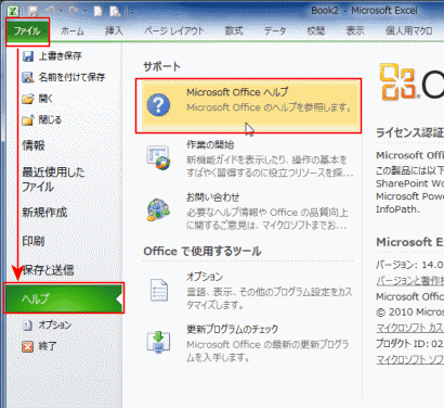 - [ファイル]タブをクリックし[ヘルプ]を選択します。