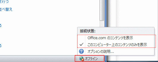 - 「Office.comのコンテンツを表示」がオンライン(インターネットを利用する)