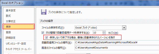 - 自動回復用ファイルの場所はこの下で指定することができます。(下図はOSがWindows7の画面です)