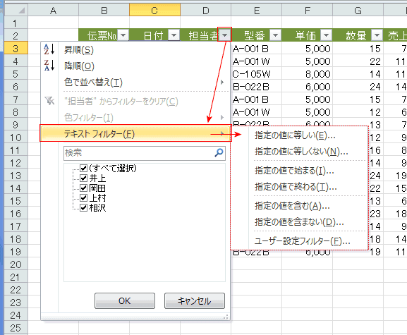 - [テキストフィルター]→[指定の値に等しい]を実行します。
