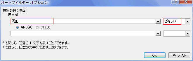 - 「担当者」に「岡田」と入力します。 右の欄では「と等しい」となっているのを確認します。