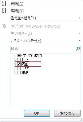一旦すべてのチェックを外して「岡田」のみにチェックを入れます。